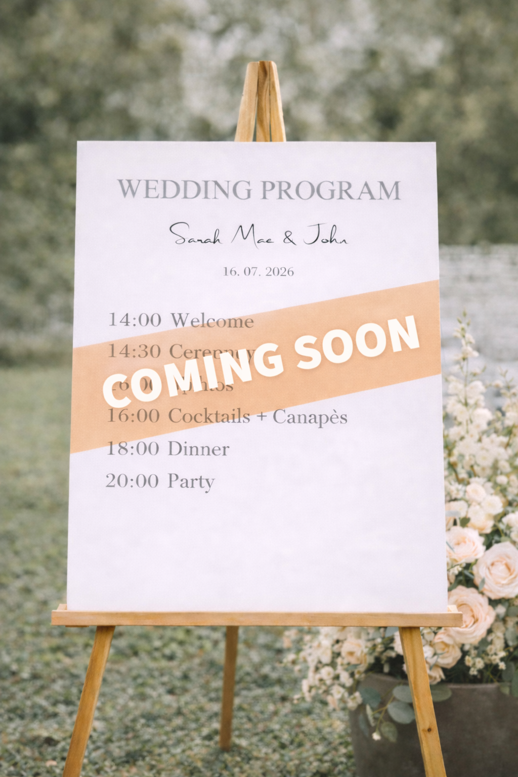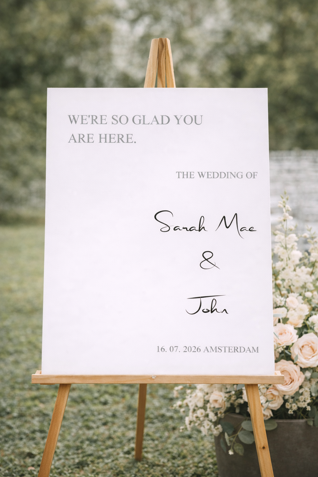 Wij maken stijlvolle welkomstborden en decoratie op maat voor jullie bruiloft, met oog voor detail en een tijdloze uitstraling.