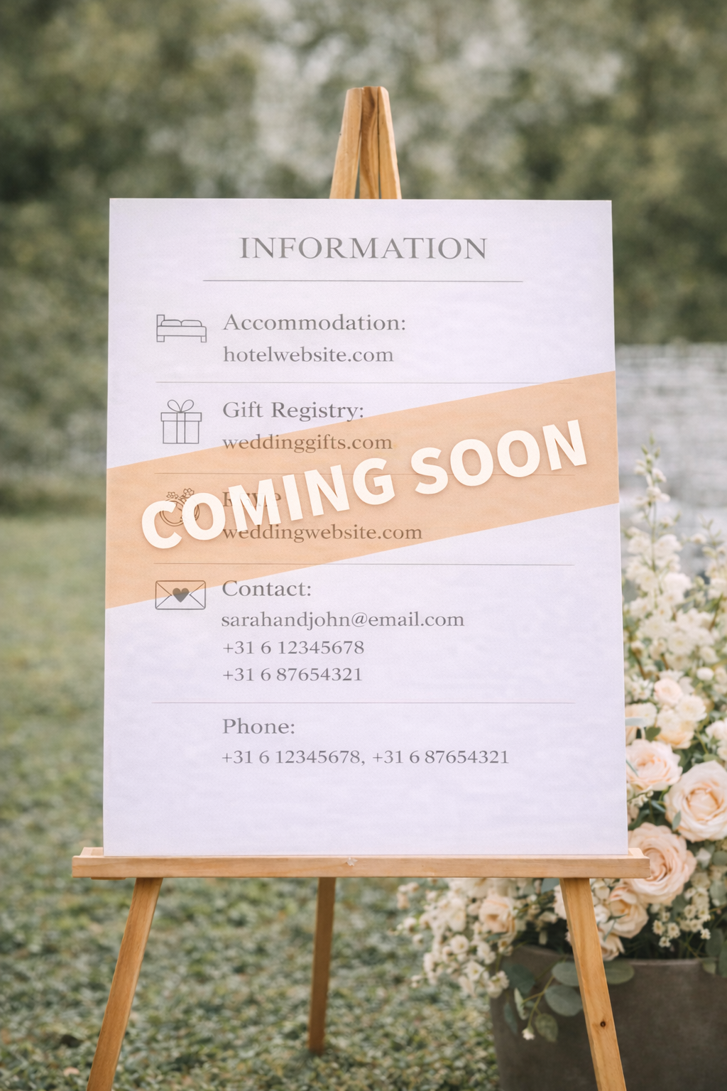 Ook als een ontwerp niet in onze collectie staat, denken we graag met jullie mee. Neem gerust contact met ons op voor maatwerk bruiloftdecoratie, zoals informatieborden, programmaborden of andere persoonlijke details. Samen creëren we een ontwerp dat perfect aansluit bij jullie dag.
