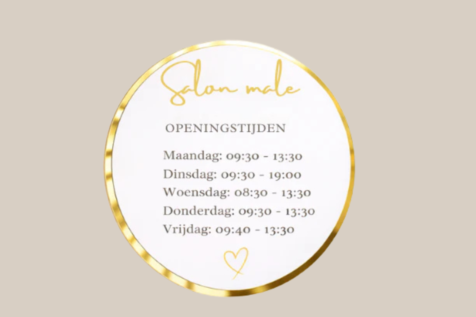 Dit luxe openingstijdenbord van acryl geeft jouw bedrijf direct een professionele en verzorgde uitstraling. Het bord wordt volledig gepersonaliseerd met jouw bedrijfsnaam en openingstijden en is uitgevoerd in hoogwaardig wit, zwart of transparant acryl, afgewerkt met een elegante gouden rand.
